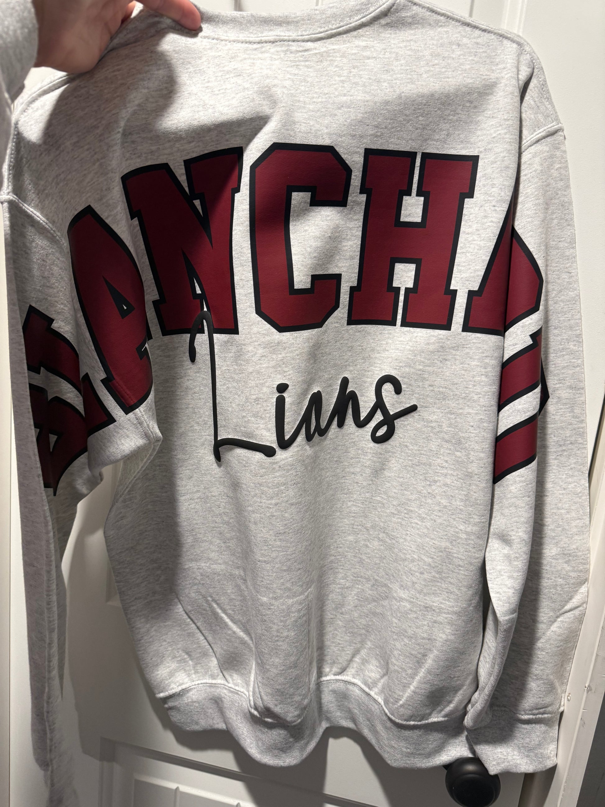 This cozy grey crewneck features a bold BLANCHARD varsity-style print in a deep maroon with black outline for that perfect game-day look. The puff script “Lions” overlays the design for a cute, modern touch. Striped maroon-and-black accents on the sleeves tie the whole look together!