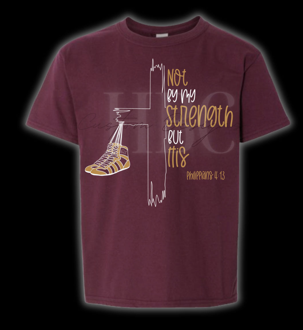 This design features a cross with wrestling shoes. The Maroon shirt has a lion on the shoes. The black shirt does not have a lion on the wrestling shoes.