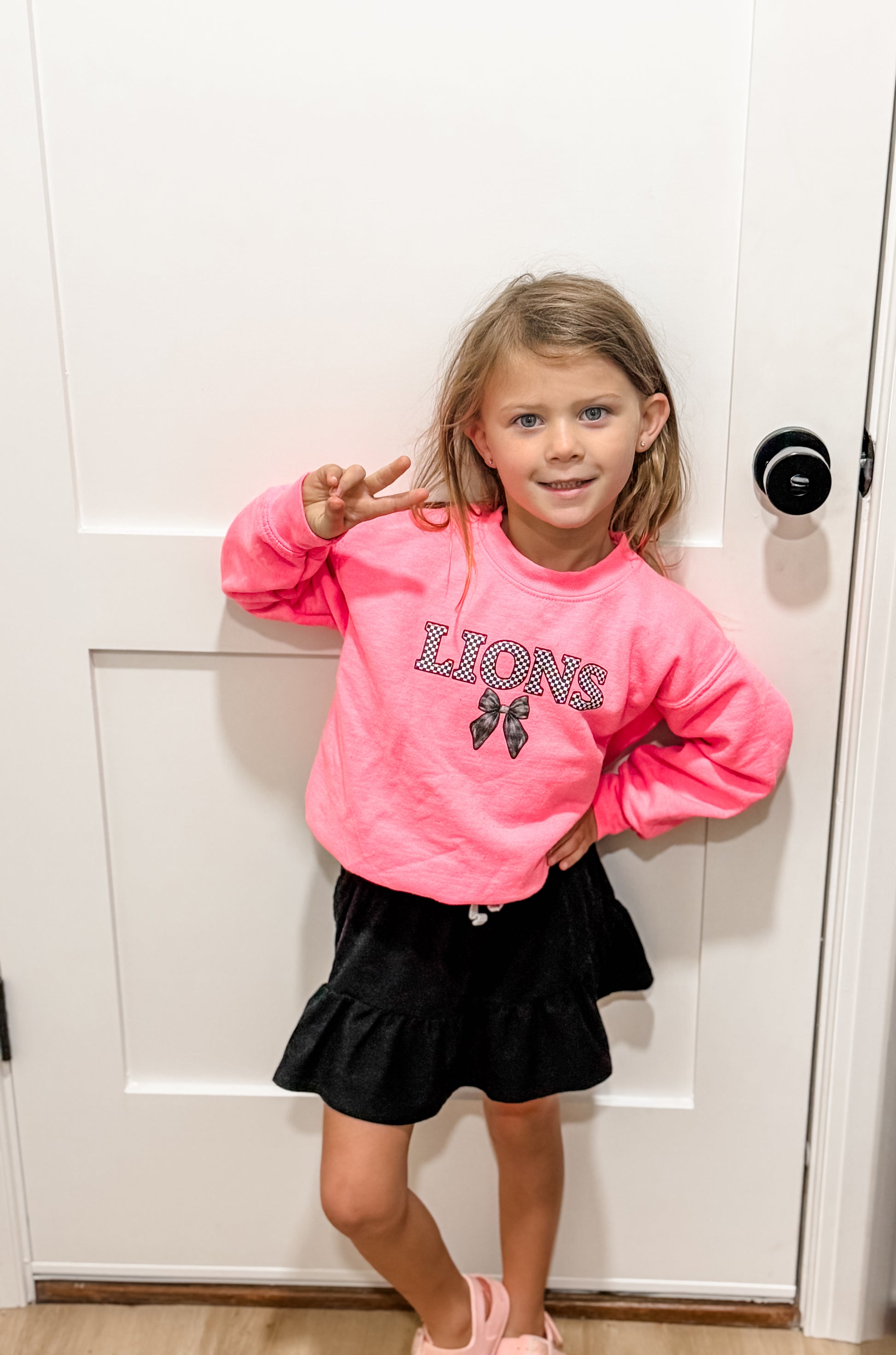 Experience the timeless charm of black and white with our Checkered Lions bow tee or sweatshirt. It's the perfect addition to your wardrobe.